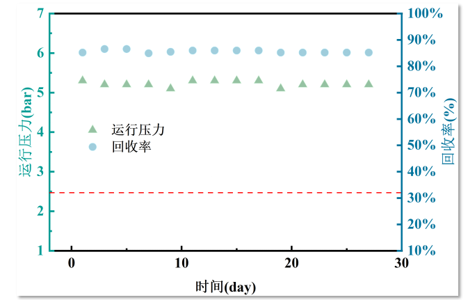 本项目旨在实现工业回用水的深度处理,为EDI系统提供优质供水。项目原水为工业回用水,经一级RO处理后的产水直接作为系统进水,进水导电度范围为100~300 μS/cm。系统关键设计参数优异,单支膜在5.0 bar工况下产水量可超过25 m³/d,常规运行压力稳定在5.2 bar左右,为EDI系统稳定运行提供了高品质、高可靠性的水源保障。
