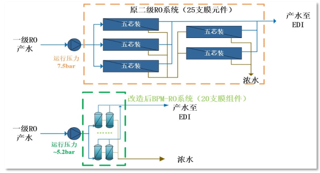 本项目采用BPM-RO系统方案,相较传统工艺展现出全方位优势,技术创新性显著:其一,采用2支膜串联设计,可在5 bar低压工况下稳定产水,产水品质卓越,导电度低于10 μS/cm,且系统回收率高达85%,远超传统卷式膜2支串联系统不足32%的最大回收率;其二,处理效率大幅提升,仅需一段BPM-RO系统即可达到传统RO两段式设计才能实现的85%回收率,且单支膜产水量较常规RO组件提升50%,有效提升整体供水效率;其三,设备采用集成化设计、模块化安装模式,现场安装流程简易,后期操作维护便捷,显著降低人力与时间成本;其四,经济性与环保性兼具,较传统RO系统减少10%的设备占地面积,同时运行能耗降低40%,大幅提升项目投资回报率与绿色效益。